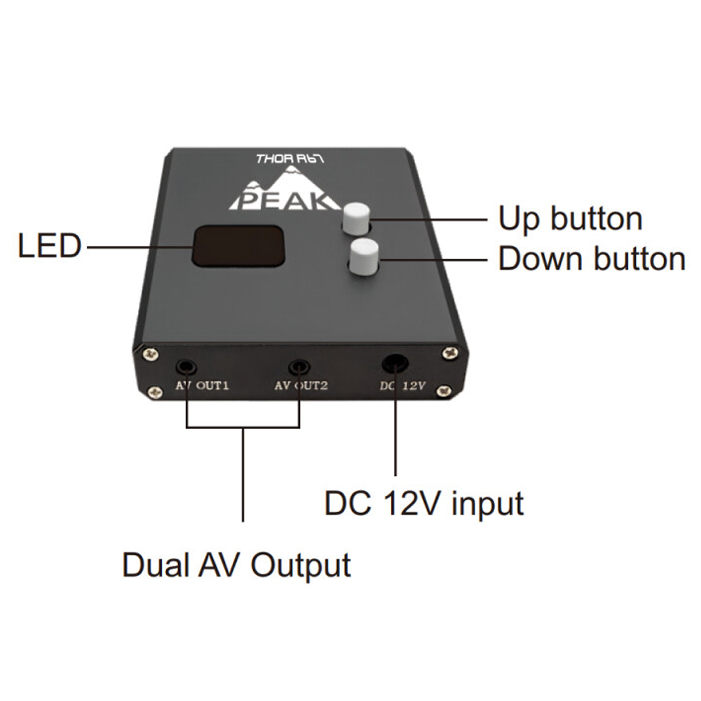 The PEAK THOR R67 video receiver is compatible with the THOR T67 transmitter operating in the 6.1-7.2GHz band for stable signal transmission without interference. The device supports 64 channels, which provides flexible customization for different usage scenarios. Two independent AV outputs(AV OUT1 and AV OUT2) allow simultaneous video signal delivery to multiple devices. Control is provided via the quick channel selection buttons, and the built-in LED indicator shows the current operating status.
